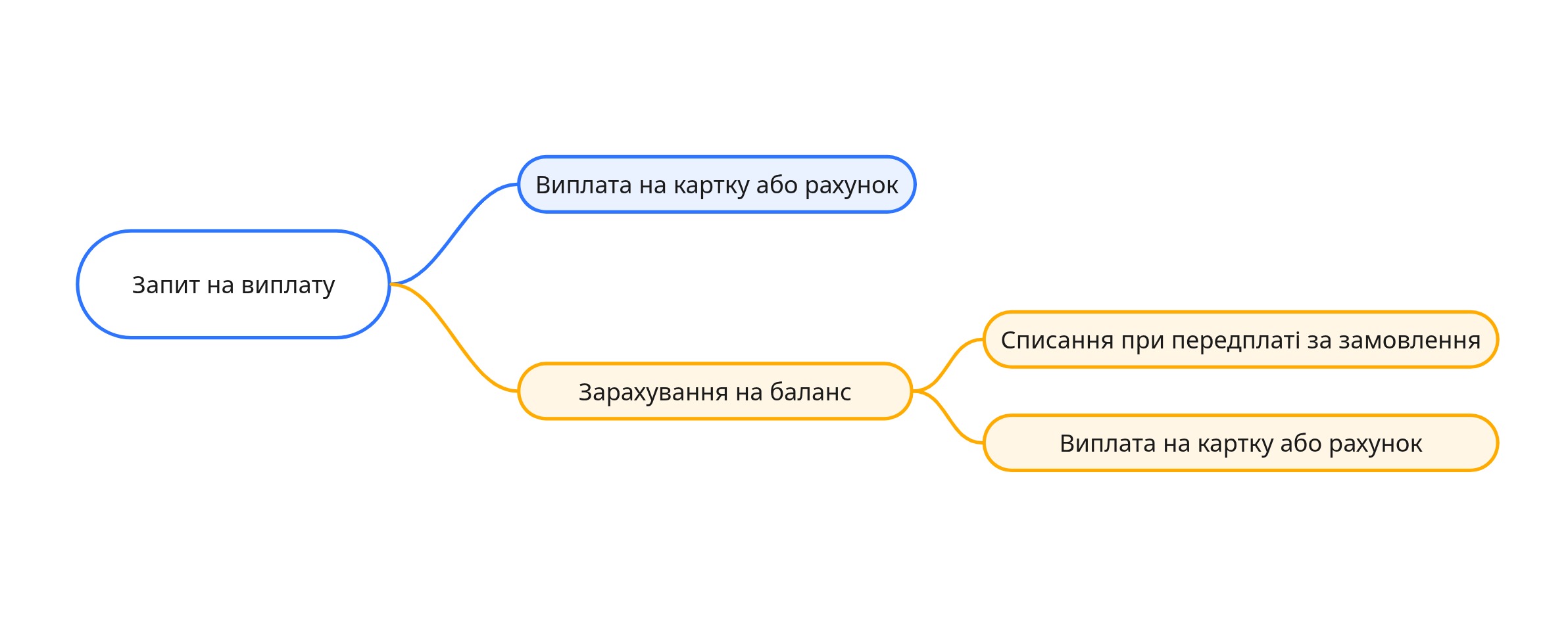 На цьому зображенні схематично показані можливі шляхи після подачі запиту на виплату: кошти або виплачуються на вказані дропшиппером реквізити, або ж використовуються для взаєморозрахунків по балансу. Детальніше про функціонал балансів читайте у окремій статті.